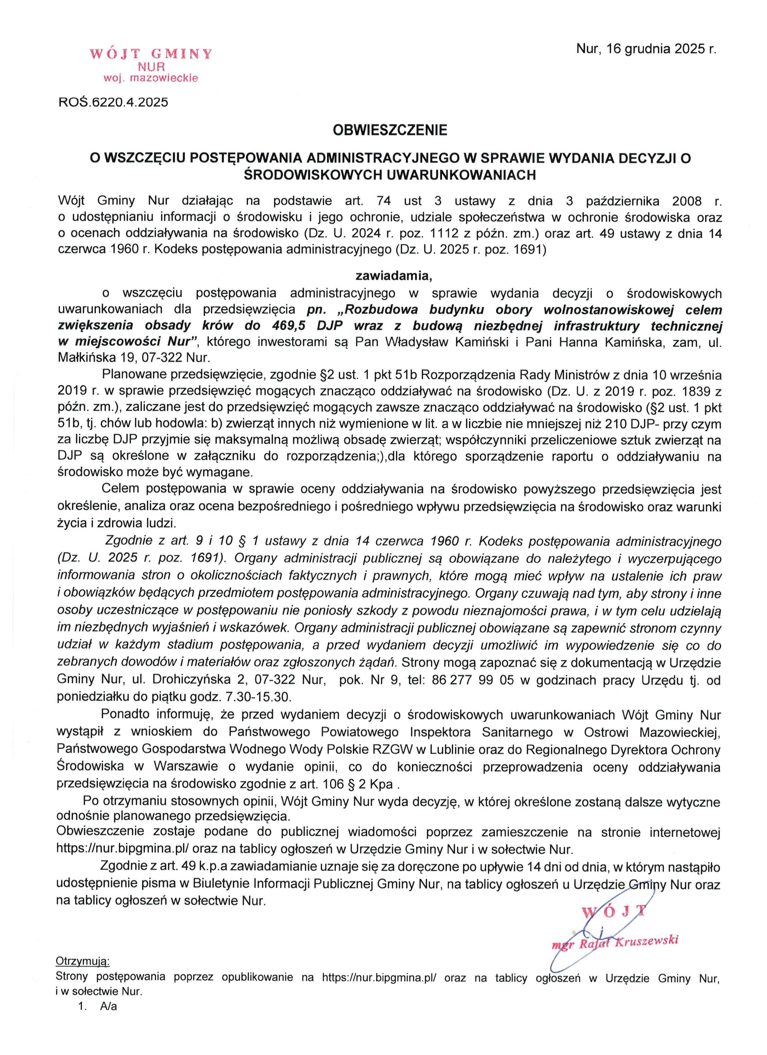 Obwieszczenie o wszczęciu postępowania administracyjnego w sprawie wydania decyzji o środowiskowych uwarunkowaniach dla przedsięwzięcia pn."Rozbudowa budynku obory wolnostojącej celem zwiększenia obsady krów do 469,5 DJP wraz z budową niezbędnej infrastruktury technicznej w miejscowości Nur". 16.12.2025 r.